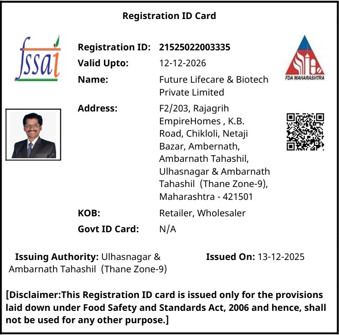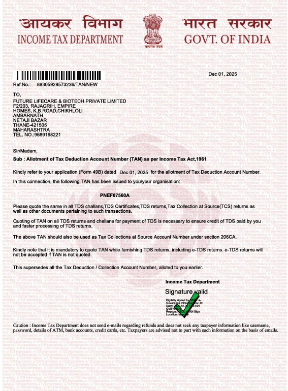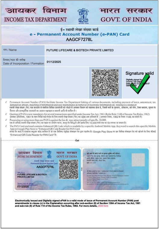 Official registrations & statutory documents of Future Lifecare & Biotech Pvt. Ltd.